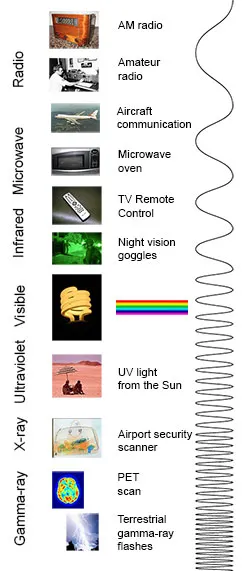 You know more about the electromagnetic spectrum than you may think. The image below shows where you might encounter each portion of the EM spectrum in your day-to-day life.