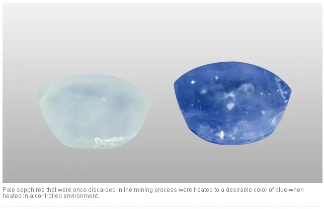 The most common and widely used method is heating, which is the oldest method. Most Sapphires in the market today have undergone this process of thermal enhancement in a furnace. The objective of heating a Sapphire is to improve its color and clarity and to eradicate color zoning. High temperatures are required to achieve this, traditionally around 4000 degrees centigrade. This dissolves silk inside opaque Sapphires, rendering them transparent. It also removes any element of color zoning in a stone, giving a more uniform color.